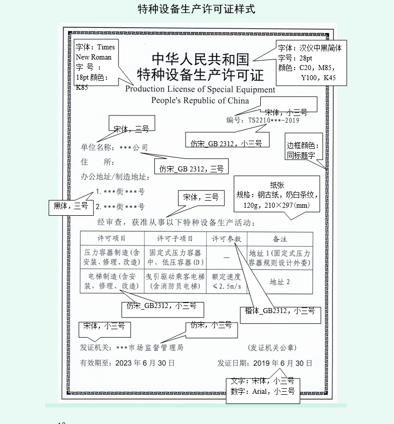9.样式中,标注颜色的为纸质许可证上预先印制的;只标注字体和字号,未标注字颜色的为计算机打印(黑色)的。